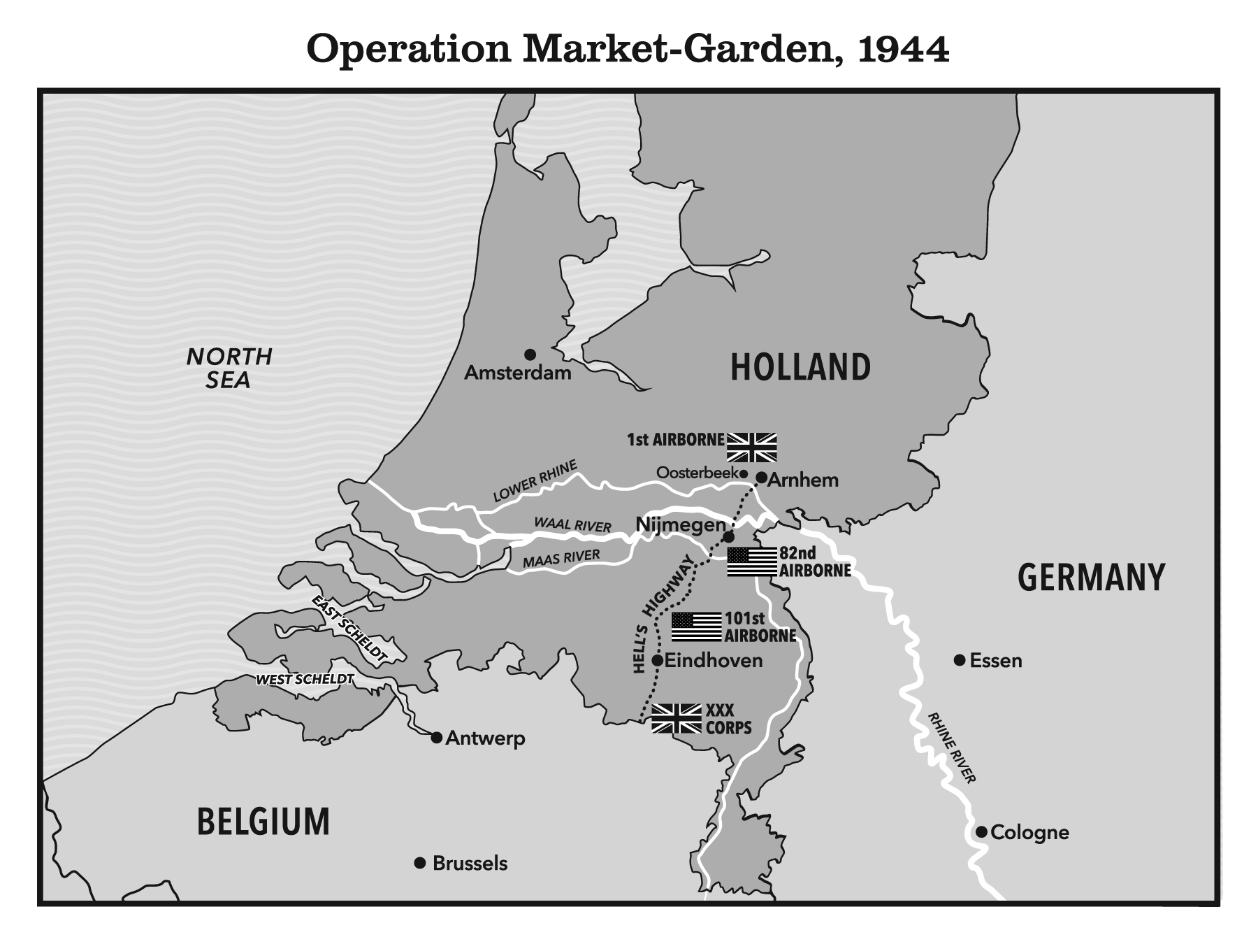 Under Operation Market-Garden, 35,000 British and American paratroopers would land behind the German lines in occupied Holland and seize a series of bridges leading north to the city of Arnhem. Further south, a powerful corps of British armor would smash through the German lines along the Belgian-Dutch border, then drive north across Holland, linking up with the airborne troops at each bridge. After reaching the last bridge at Arnhem, the armor would cross the Lower Rhine River into Germany and sweep into the Ruhr Valley, the country’s industrial heartland.