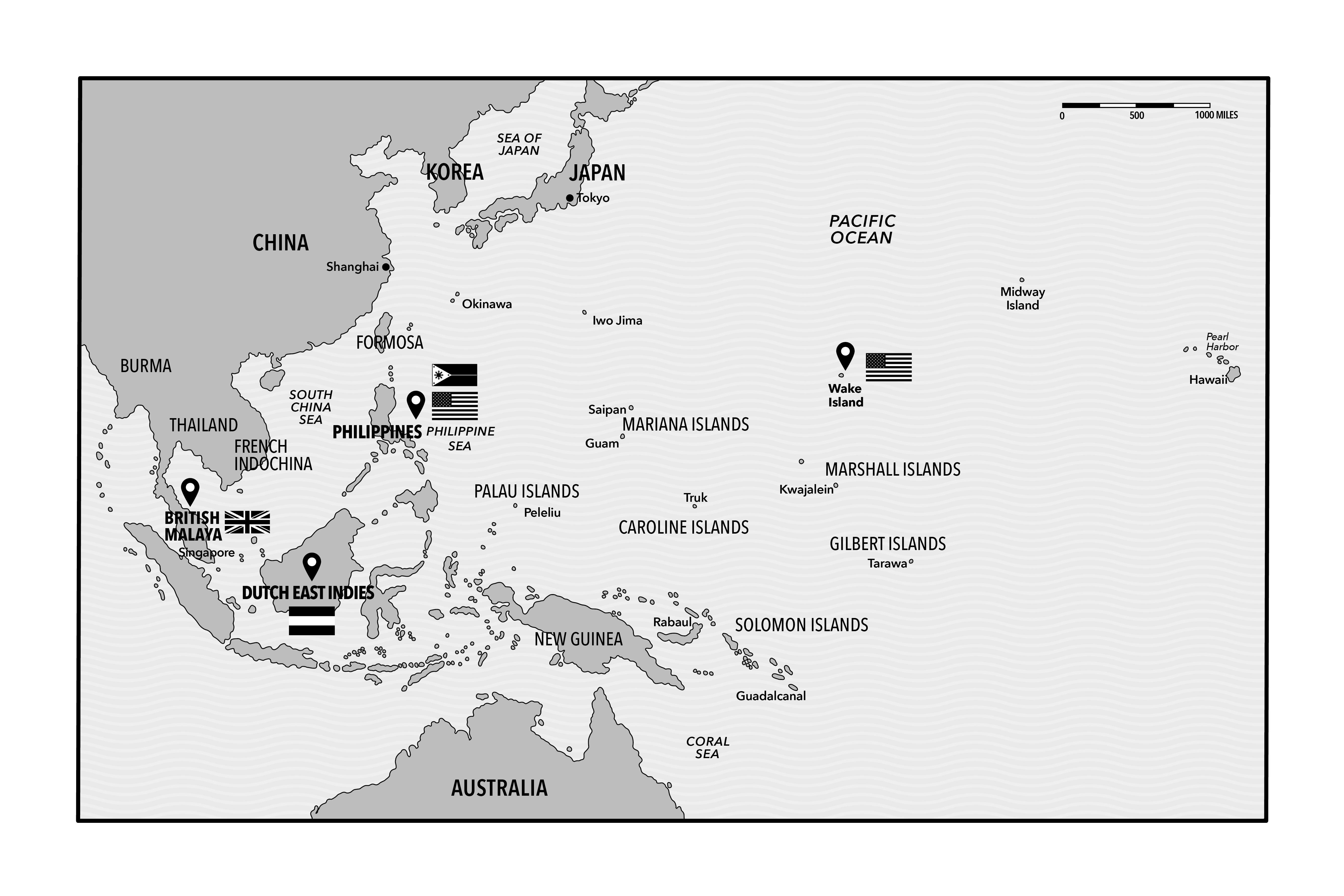 The Japanese claimed another valuable prize in early 1942, seizing control of the Dutch East Indies (present-day Indonesia) and vast oil reserves that would fuel the Imperial Navy. Their greatest test, though, would come in the Philippines, where 19,000 American soldiers and 12,000 US-trained Filipinos under the command of General Douglas MacArthur defended the former US territory. It was a dismal start for the Americans, with most of MacArthur’s supporting air force destroyed by a Japanese air strike on the very first day of the war. When a large invasion force landed on the main island of Luzon, MacArthur had to abandon the capital of Manila and shift his army to the Bataan Peninsula, where American and Filipino troops held out for weeks despite severe shortages of food, ammunition, and medicine.