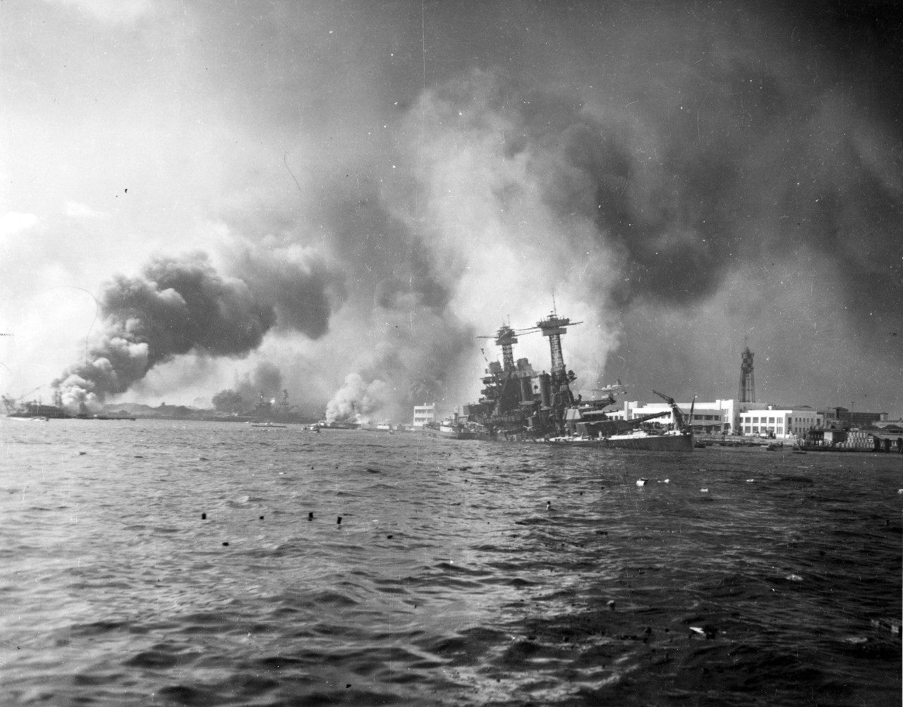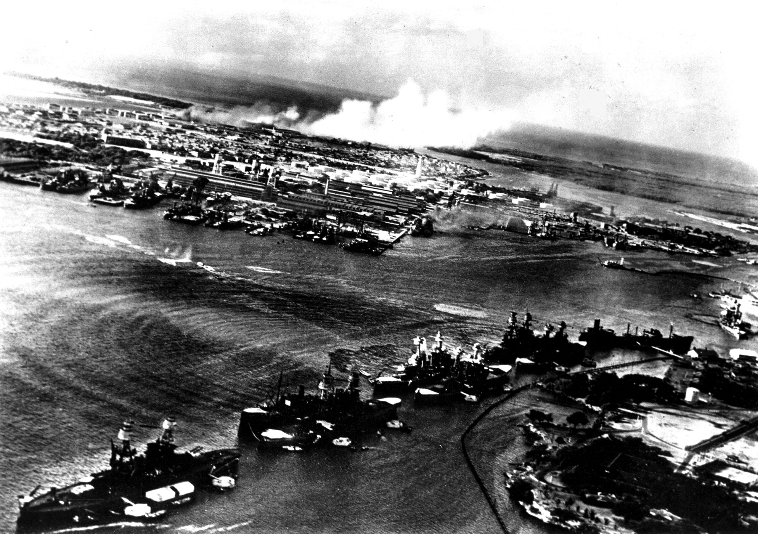 An hour after the attack began, a second wave of 170 planes swooped in, pasting the harbor and surrounding airfields again. Battleship Row was devastated, with the USS California and USS West Virginia joining the Arizona on the harbor bottom and the USS Oklahoma fully capsized. Smoke also billowed from air bases across Oahu, where Japanese bombs and strafing attacks had destroyed entire fighter squadrons parked on open tarmacs.