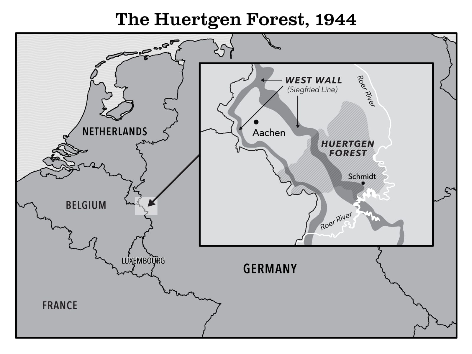 Amid the struggles of Montgomery and Patton, Lieutenant General Courtney H. Hodges forged his own path to Germany in the center. His First Army numbered some 250,000 men, and many were veterans of the North Africa and Normandy campaigns. Their march to the West Wall, spearheaded by the infantry and armored divisions of the VII Corps, had to pass through a narrow corridor bracketed on the left by the German city of Aachen and on the right by the Huertgen Forest, a dense patch of woods stretching across fifty square miles. As the 3rd Armored Division led the way toward the West Wall, its flanks were protected by two infantry divisions, with the 1st Division wheeling toward Aachen, and the 9th Division ordered into the Huertgen, where German forces awaited.